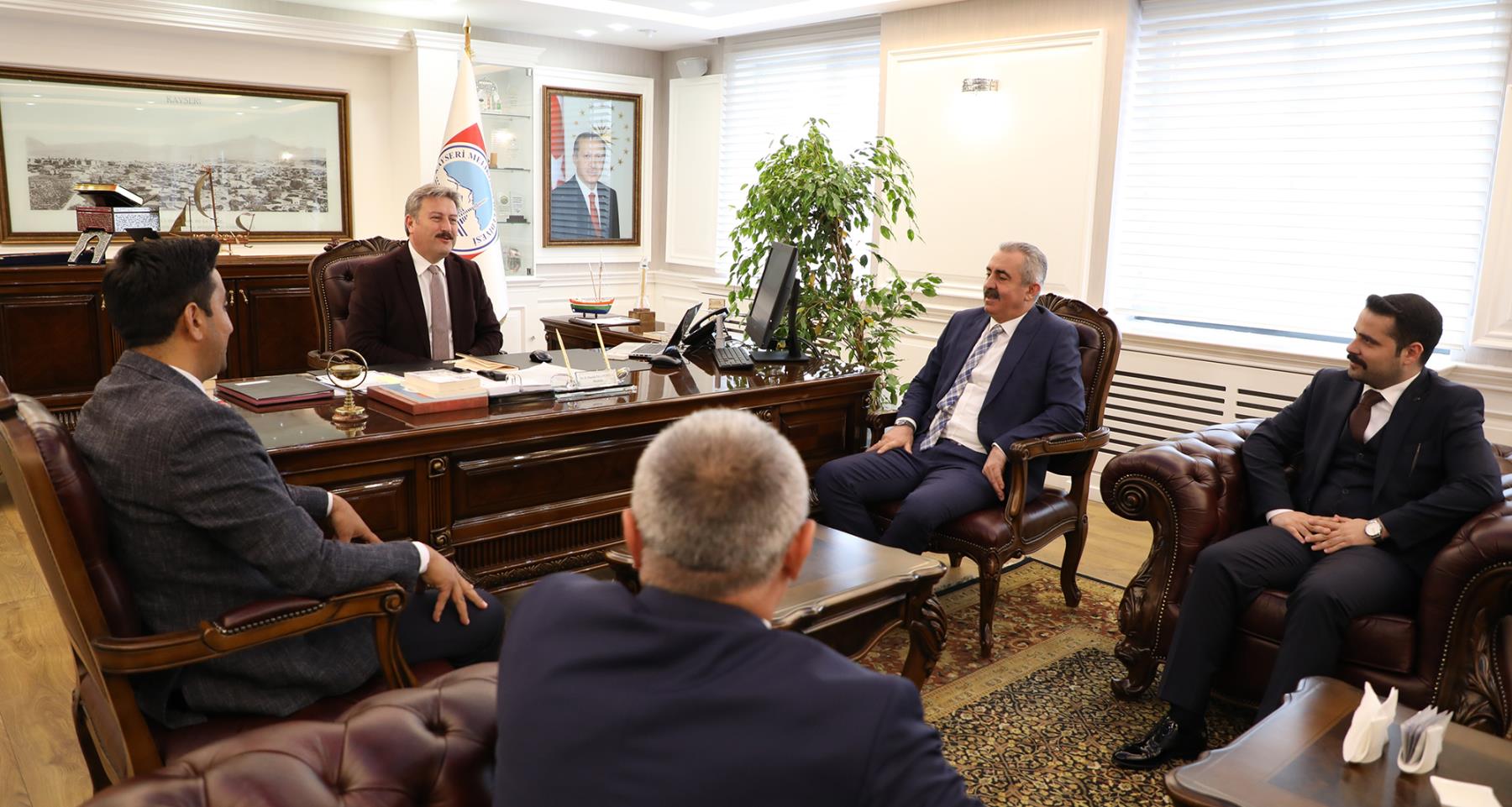 BİRLİK VAKFI Başkanı Mehmet Adıgüzel ve Yönetim Kurulu Üyeleri, YÖRTÜRK VAKFI Başkanı Ali Aydın ve Yönetim Kurulu Üyeleri ile HİZMET-İŞ Kayseri Şube Başkanı Serhat Çelik, İŞ Konfederasyonu Hizmet-İş Sendikası Genel Başkan Yardımcısı Halil Özdemir ve sendika üyeleri; Melikgazi Belediye Başkanı Dr. Mustafa Palancıoğlu’nu ziyaret ederek, büyük bir oy oranı ile seçilmesinden dolayı hem tebrik edip, hem de başarı dileklerinde bulundular.
